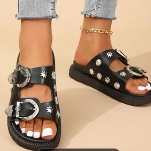 These sandals boast a bold design with wide black straps adorned with silver metallic studs, secured by silver buckles for a punk-inspired flair. The molded footbed ensures comfort, while the thick sole provides durability and a trendy platform look.