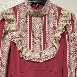 This stunning maxi dress features a ruffled, tiered design in a beautiful pink and cream color palette. The long bishop sleeves and mock neck add a touch of elegance, making it perfect for a wedding guest or cocktail occasion. The bib collar enhances its sophisticated style, creating a timeless and graceful look.