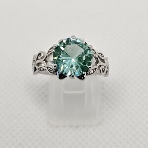 Exquisite 3.45 carat light green lab created spinel gemstone in an elegant setting with vine design accented by white zircons along the shank. Size 8