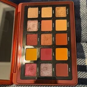 This eyeshadow palette features a range of vibrant colors including gold, orange, red, and brown. Perfect for creating bold and colorful eye looks.