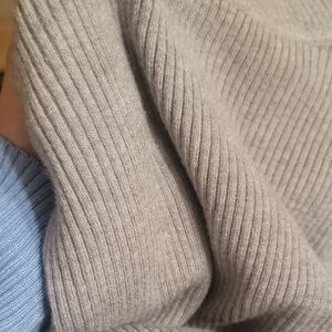 Gray stretch knit turtleneck with long sleeves. Very stretchy and comfy, but runs small- tag says Medium, but fits like a small. I brought it recently and tore off the tags, but is just too tight on me.