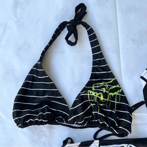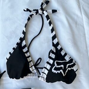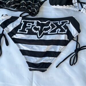 Y2K bikini set with bold stripes. Features Fox logo on top and bottom. Halter neck design. The white top has a stain on the inside lining you cannot see through, I just added it to the set because I think it’s cute. Since it is from the early 2000’s it says large but now it would be considered a petite Medium Open to offers, * Smoke free home* 🖤🦇