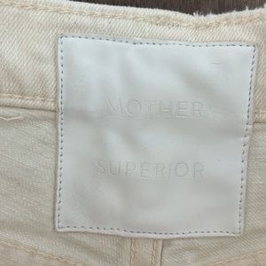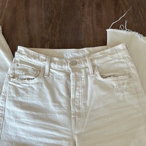 These cream-colored jeans from MOTHER feature a stylish flare and wide-leg design, perfect for adding a touch of elegance to any outfit. The high-rise waist and raw hem offer a modern, chic look, making them a versatile addition to your wardrobe.