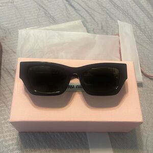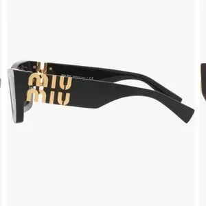 These Miu Miu sunglasses feature a bold rectangular frame in black, complemented by gold detailing on the temples. Crafted from high-quality materials, they offer a luxurious and modern aesthetic perfect for any fashion-forward individual.