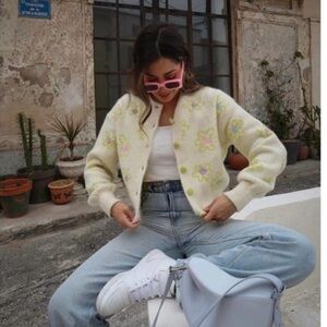 Zara knit cardigan with round neck and long sleeves. Colorful spring floral embroidery detail. Rib trim front closure!