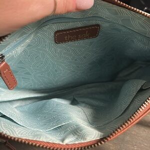 Elevate your style with this chic leather crossbody bag. Featuring a blend of tan, cream, and green, this bag is perfect for any occasion. Its sleek design and practical compartments make it a must-have accessory.