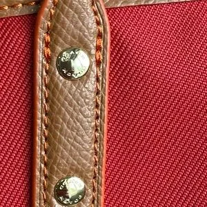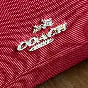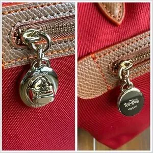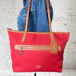 For those seeking a lightweight yet striking bag, the Sawyer Tote from Coach is a perfect choice. Crafted from red heavy-duty canvas with brown leather trim, it adds a bold pop of color to any outfit. The pinmount logo showcases the iconic horse and buggy design, while the distinctive Turnlock zipper pull—an homage to Bonnie Cashin—features a turnlock on one side and the buggy on the back. The Sawyer tote’s tag is uniquely gold-embossed, larger than the standard Coach hangtag, and printed on both sides in a vintage-inspired style. Coach branding is elegantly engraved on strap rivets and zippers.