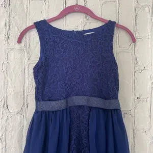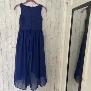 Disney’s d-signed descendants Evie lace romper. It is blue and features a lace bodice and a chiffon skirt with a high-low hemline. The dress has a sleeveless design and a round neckline. A glittery band accentuates the waist. The dress is in good condition with no visible imperfections but the embellishment on the belt is missing. It has a zipper closure in the back. See last photo for how it was supposed to come. Girl’s size medium.