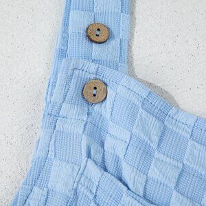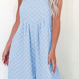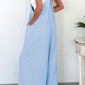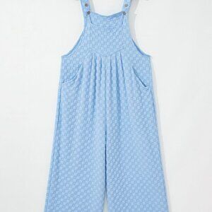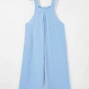 These light blue checkered wide-leg overalls are a spring & summer wardrobe essential. Featuring adjustable shoulder straps with button detail, roomy pockets, and a soft textured fabric — this relaxed one-piece is perfect for layering with tanks, tees, or crop tops.