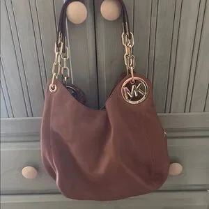 This Michael Kors shoulder bag showcases a rich brown leather with a slouchy silhouette, complemented by a gold-tone chain-link strap and a signature MK medallion, making it a versatile choice for everyday elegance.