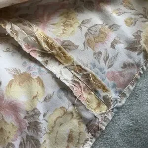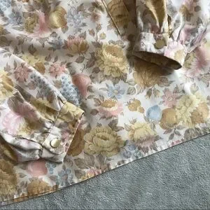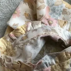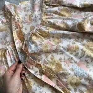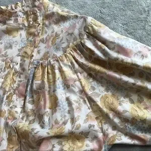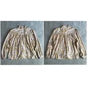 Great vintage condition. Handmade High Neck Ruffle Prairie Cottage Floral Blouse in white with muted red, blue, tan and yellow detailing. Circa 70s. Boho cottagecore aesthetic. Long-sleeve top with high ruffle neck collar and flowy swing silhouette, see video for detail. Hidden button-front placket. Allover fruit & floral print. Wide bishop sleeves with button cuff. No interior fabric or size labels, listed as medium based on measurements, see photos for measurements.