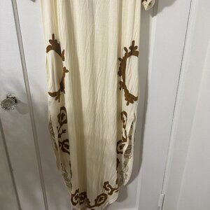 White floral shapes embroidered around neckline sleeves and hem, curved hem, flowy oversized fit, self tie on back, two side pockets, maxi length, v neckline, soft stretchy jersey, mustard yellow, half sleeve length, boho, bohemian, beachy, fp maxi
