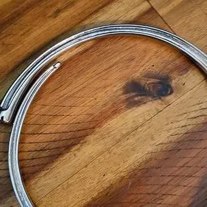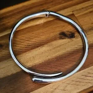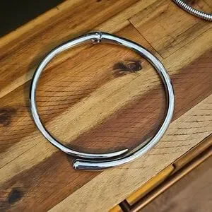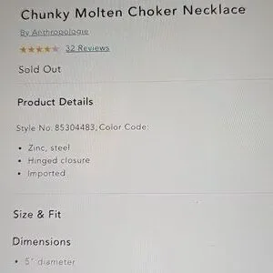 Bold choker necklace with a molten design. Features a hinged closure. Made from zinc and steel.