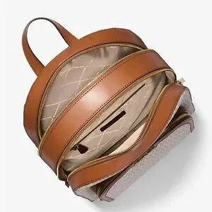 This Michael Kors backpack showcases a sophisticated blend of cream and brown tones, highlighted by the iconic MK logo print. Crafted with premium materials, it offers a stylish and functional design perfect for everyday use. Absolutely brand new from manufacturer, partially unwrapped for photograph only, tags intact.