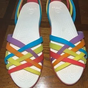 Experience the perfect blend of comfort and style with these CROCS sandals, featuring a striking blue and purple color scheme. Designed with a durable rubber sole and intricate criss-cross straps, these sandals are ideal for casual summer outings. Enjoy the open-toe design that keeps your feet cool and comfortable all day long.