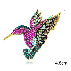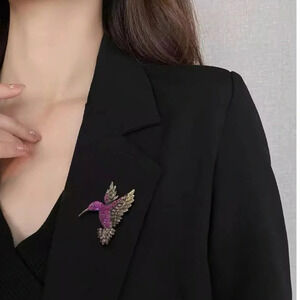 Elegant hummingbird brooch with pink and green crystals. Gold accents enhance the design. Perfect for adding a touch of nature to any outfit.