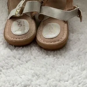 These b.o.c. sandals feature elegant white leather straps with intricate floral cutout patterns, complemented by a tan suede-like footbed. The flat thong-style design and adjustable ankle buckle ensure comfort and a secure fit, making them perfect for casual summer outings. Soles are in great condition with minimal wear.