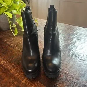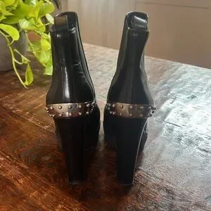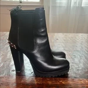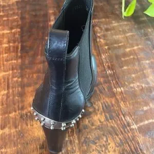Step out in style with these sleek black leather ankle boots. Featuring a chic studded heel, these boots add a touch of edge to any outfit. Some flaws but over all in excellent condition. No scuffs. See photos. Original owner, tab on right shoe needs repair. Worn a few times . Smoke free pet free home.