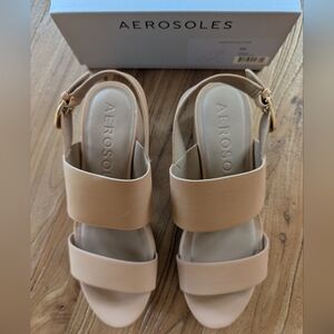 Tan heels from AEROSOLES with a chunky platform sole. Features two wide straps and a secure ankle strap with a buckle closure. Worn once and in great condition.