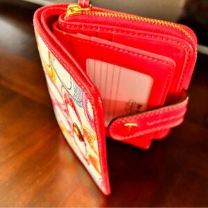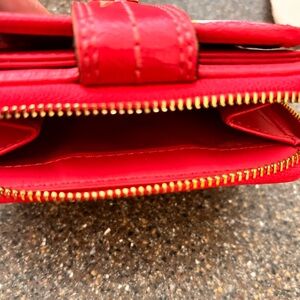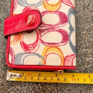 Coach ladies wallet, small, white with multi color “C” pattern. Fuschia lining and trim. Snap closure.