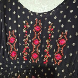 This chic Shyanne mini dress features an asymmetrical design with intricate embellishments on a classic black fabric. The tunic-style silhouette and 3/4 length sleeves offer a stylish and comfortable fit, perfect for any occasion.