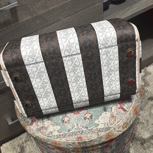 Discover the timeless elegance of the Michael Kors satchel, featuring a sophisticated brown and white color palette. This structured bag is designed with a classic satchel shape, making it a versatile choice for everyday use. Adorned with gold-tone hardware, it seamlessly blends style and functionality.