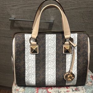 Michael Kors Grayson Logo White/Brown Satchel with Gold Accents