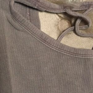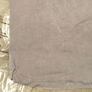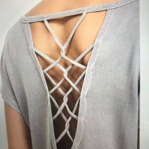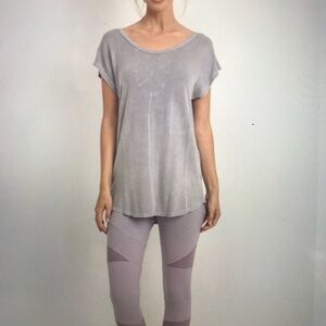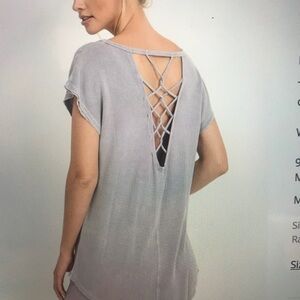 This just might be your next favorite top, for workout or just lounging. Mineral washed, 95% rayon, 5% spandex. Casual, longline, flowy top features midi-length sleeves and a lattice style accent that crisscrosses over the V shaped cutout on the back. Very light lavender, almost grayish. Small pit to pit is about 19, length 24-27 side to middle.