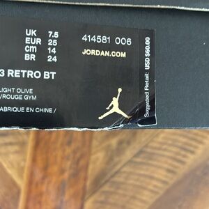 Brand new, Jordan 13 Retro BT size 8C. Black/Gym Red-Light Olive. With box and sticker. No pets, no smoking.