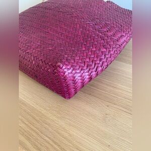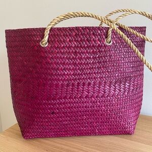 This hand woven pink tote bag will add a pop of color to any outfit. It is big enough for daily essentials or to be used as a beach bag easily fitting towel, water bottle etc as in photo