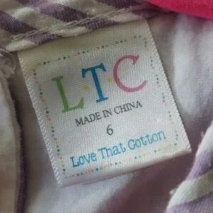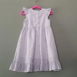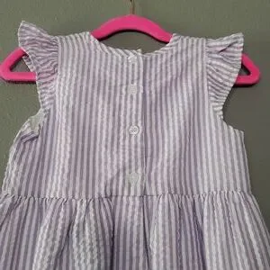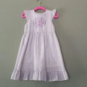 Seersucker sundress with ruffle sleeve. Fully lined. Fabric "patch" style monogram. Ruffle hem.