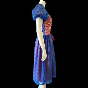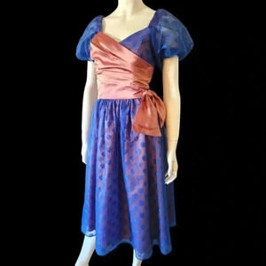 Vintage 1980s hand sewn cocktail gown in a 1950s style. Cobalt blue lace over rose pink satin. Sheer puff sleeves with elasticized arm openings, satin crossover bodice with bow detail, fitted waist, full skirt, back zip closure. Excellent condition with no flaws to note. Will best fit a size XXS; see measurements below.