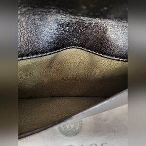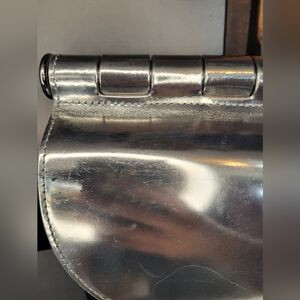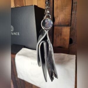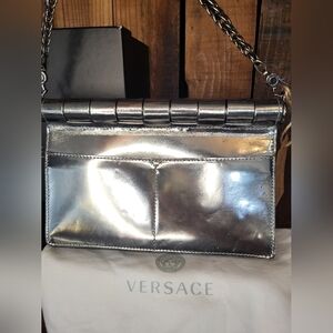 Pre-Owned Rare Versace Silver Mirrored Leather Flap Chain Shoulder Bag. The fashion house’s tradition of excellence, coupled with modern design sensibilities, works to make this Versace bag one of a kind. It's a fabulous accessory for everyday use. It has two separate compartments. In good condition with scuffs, crease in some areas, slight mark on exterior, minor scratches on metal (see photos). It includes box and dust bag.