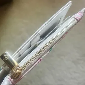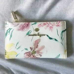This elegant wallet by Nanette Lepore showcases a beautiful watercolor-style floral pattern on a white base, accented with soft pink hues. Crafted from a structured material, it features a gold-toned zipper closure and a subtle brand emblem on the front, making it a perfect accessory for any occasion.