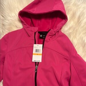 Bold pink jacket by Spyder. Features a hood and front zipper. Sleek and stylish design. Fleece lining, Size small NWT
