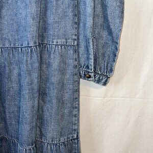 Billy T denim dress, midi denim dress, cotton lyocell dress, tiered denim dress, long sleeve denim dress, women’s casual dress, pullover denim dress, blue denim midi