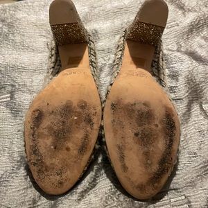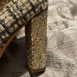 These J. Crew heels feature a stunning gold finish, perfect for adding a touch of elegance to any outfit. With a classic pump silhouette and a medium-height heel, they offer both style and comfort. Ideal for special occasions, these heels are a must-have addition to your shoe collection.