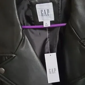 Elevate your style with the GAP Women's Black Faux Leather Jacket. This sleek and versatile piece is perfect for any occasion. never worn with tag no holes no scratches smoke-free pet-free home length of jacket is top of hip