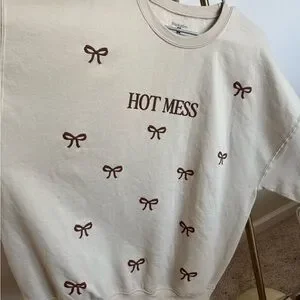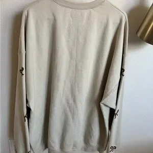 This cream sweater showcases a timeless crew neck style, highlighted by delightful brown bow details on the front. Made from a soft, comfortable fabric, it ensures warmth and ease for any casual occasion.