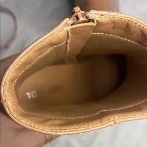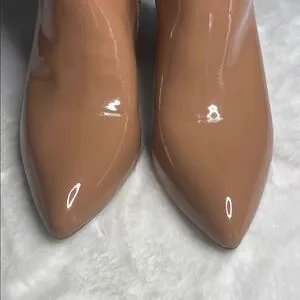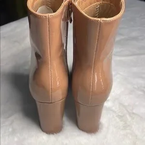New- Top Moda-shiny patent tan ankle booties, includes dust bags to keep them scratch free while in storage.