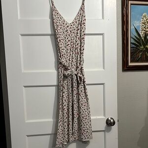 This elegant sundress by Reformation showcases a floral design with a versatile tie wrap for front or back — ideal for a wedding guest or a date night out. The sleeveless, spaghetti strap neckline complements the cream and red flowers, offering a chic and breezy style. Its midi length and feminine silhouette make it perfect for warm weather occasions.