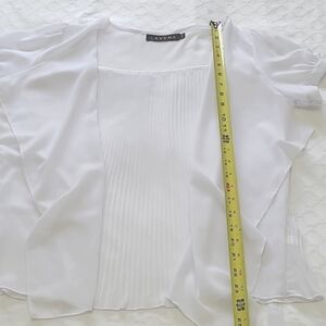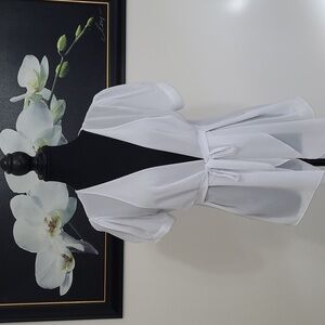 This crisp white blouse features a pleated back design and a tie back/tie front detail. The short sleeves have a slight dainty puff, and the lightweight fabric offers a semi-sheer, airy feel, perfect for a sophisticated yet relaxed look.