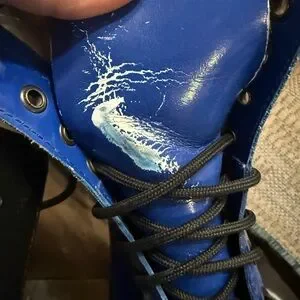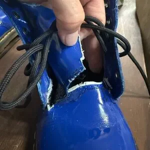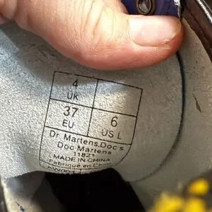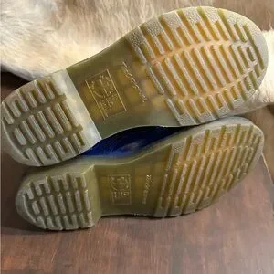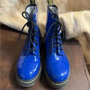 These striking Dr. Martens boots feature a glossy blue patent leather finish, an 8-eye lacing system, and a chunky sole with visible stitching, making them a bold statement piece.Tongue on one boot has been ripped. Still attached and could be redeem but tongue was unthreaded and has marks discoloring the top of you hue. All in photos. Otherwise in amazing shape!!