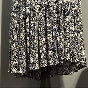 Chic and comfortable floral V-neck dress perfect for any occasion. Features a beautiful blend of navy blue with white flowers.