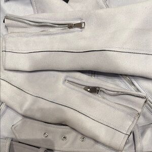 Embrace the timeless appeal of this gray leather moto jacket, featuring an asymmetrical front zipper and a notched collar with lapels. The belted waist adds a touch of sophistication, while the structured silhouette ensures a flattering fit. Perfect for elevating any outfit with its classic yet versatile design.