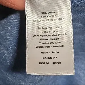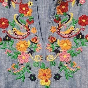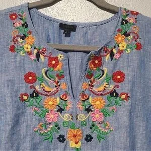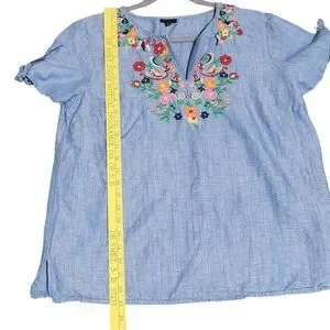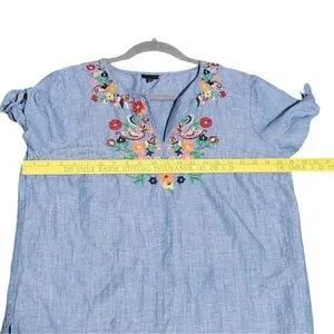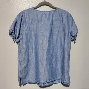 TALBOTS S/S Linen Blend Floral Embroidered Tie Sleeve Chambray Blouse SZ…