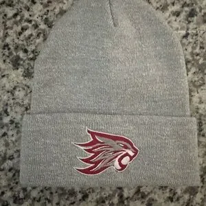 Stylish gray beanie featuring a bold red logo. Perfect for casual wear.