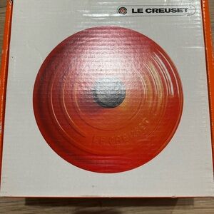 Bright orange Le Creuset Dutch oven with a black knob. Iconic design and color.