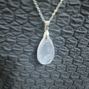 Very light colored pink rose quartz teardrop pendant on silver copper bail and 18” silver copper chain with lobster clasp closure. Pendant has very light pink hue. Pendant is about 1” long and .5” wide at widest point.
