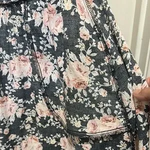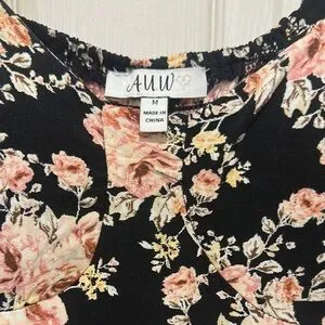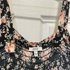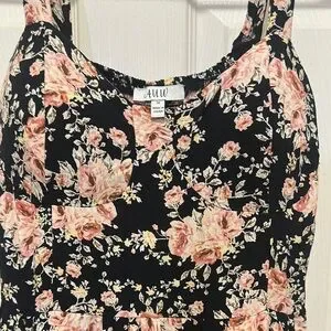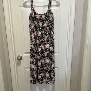 This casual sundress features a black background adorned with pink floral patterns, perfect for warm weather outings. The sleeveless design with spaghetti straps offers a comfortable fit, while the midi length adds a touch of elegance. Its fitted bodice flows into a slightly A-line skirt, creating a flattering silhouette.